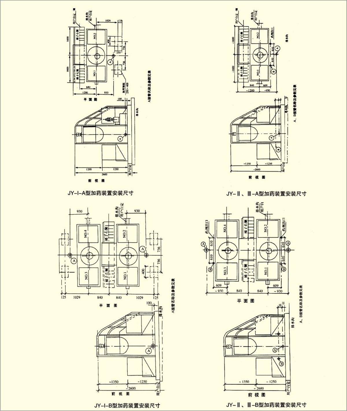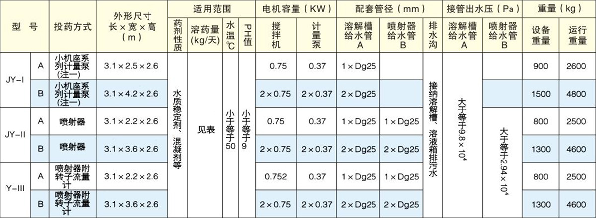 JY型加藥裝置配有一個玻璃鋼材質(zhì)的藥劑溶解槽,并配有一套電動攪拌機,兩個藥劑溶液箱,一套投藥裝置及配管、鋼制平臺梯子等原件組成一個整體。